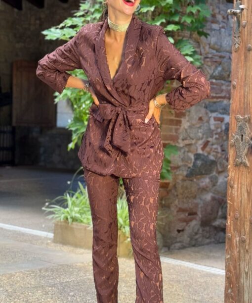 Un traje de chaqueta y pantalón tobillero. Estampado brocado.