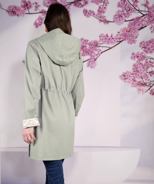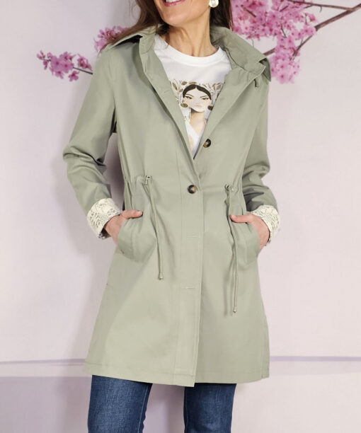 Un Trench con gorro desmontable, cintura que se ajusta con cordón exterior, bolsillos en la posición natural de las manos y un porte que da que es un completo ESCANDALO.