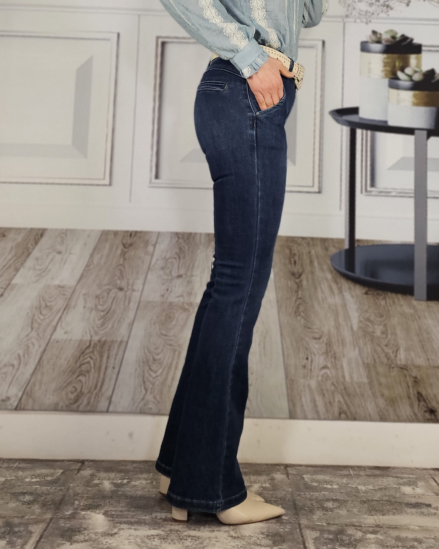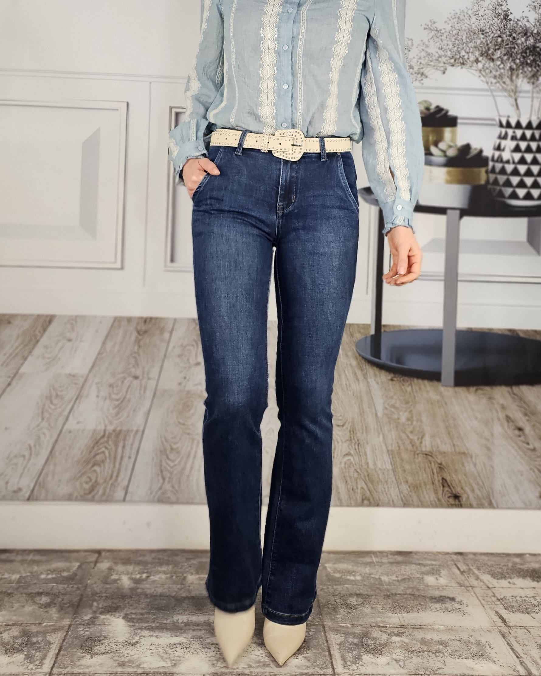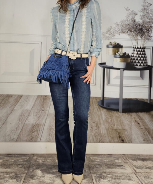 Es un vaquero recto que termina en campana. Hace un culete perfecto y sienta espectacular. Una tintada azul brutal .