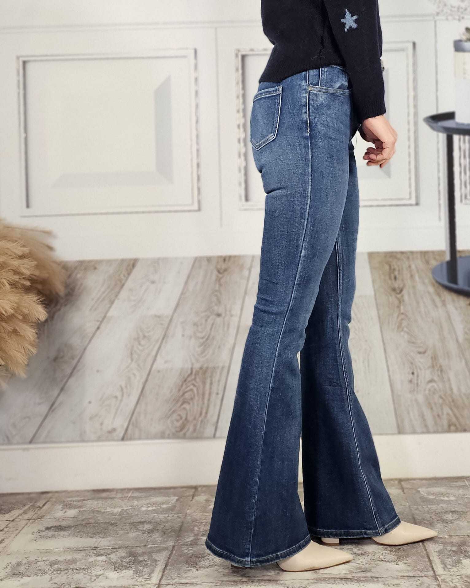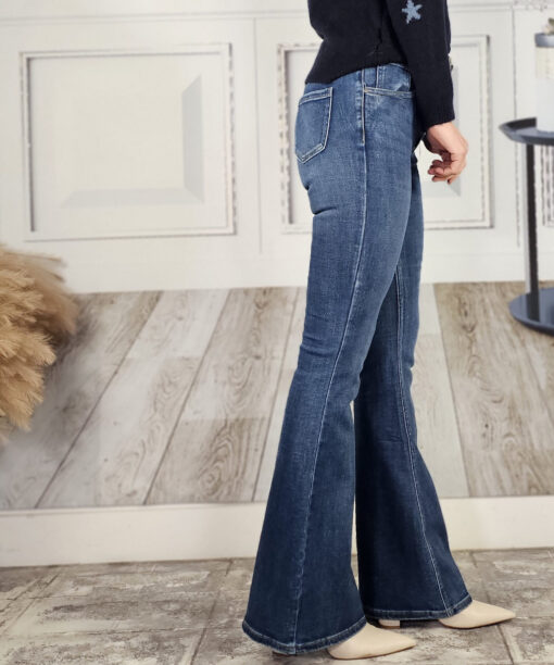 Es un vaquero recto que termina en campana. Hace un culete perfecto y sienta espectacular. Un tono azul perfecto.