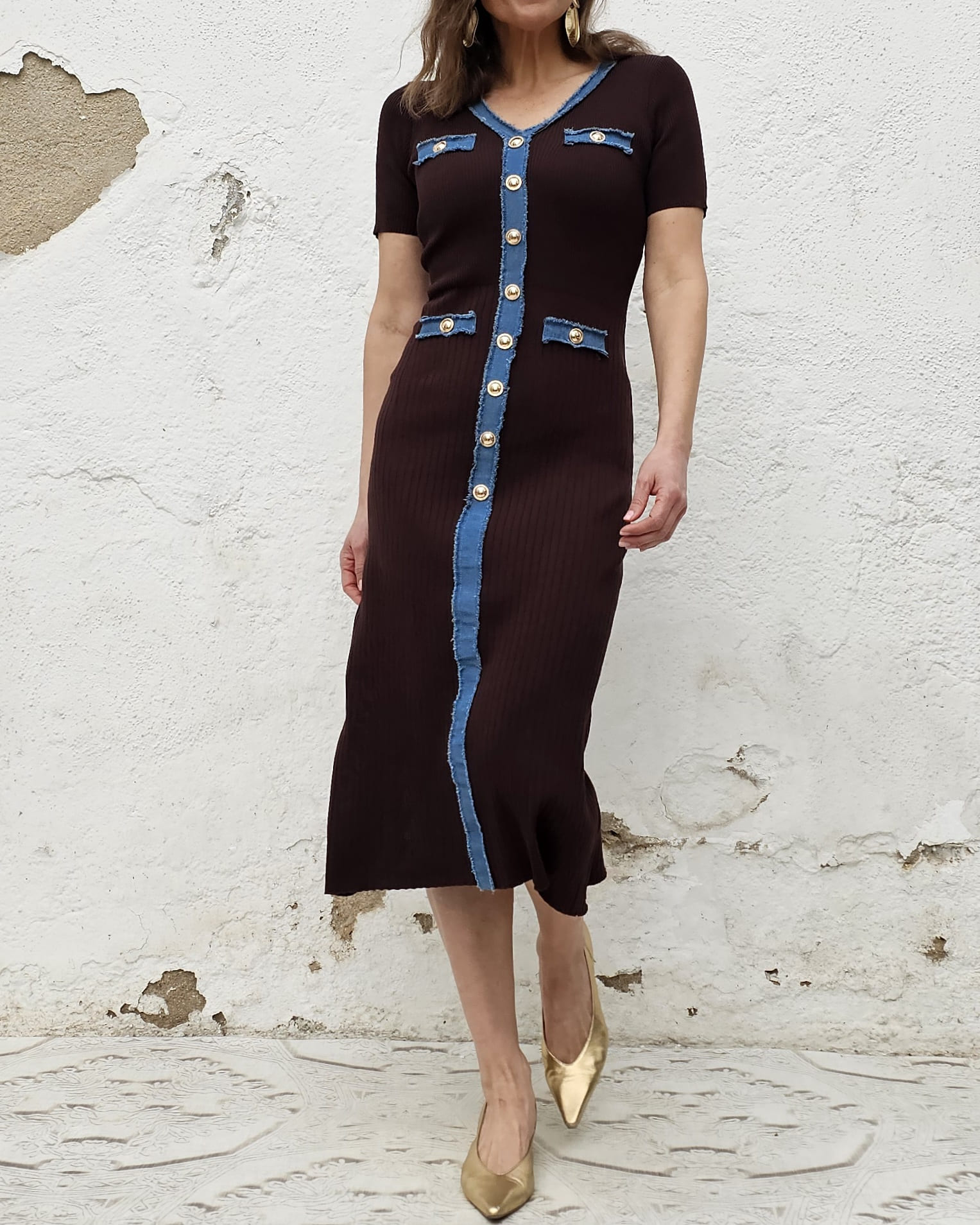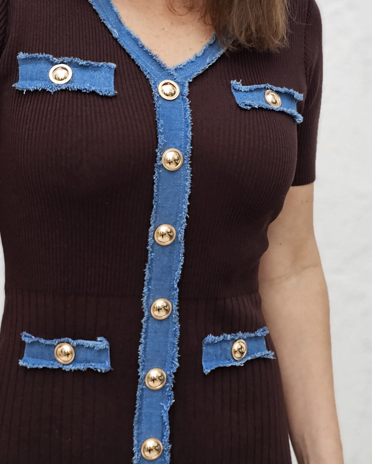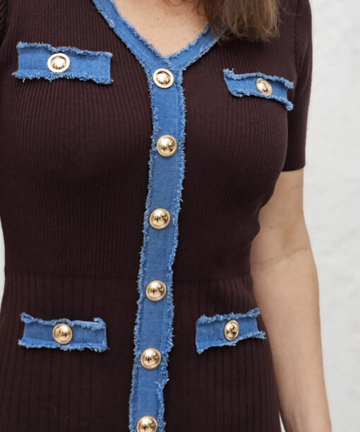 Dicho todo esto: El vestido Antía es una pijada. Es marron de canalé suave  con tapeta en tono azul denim.