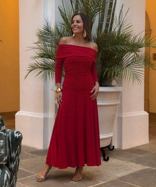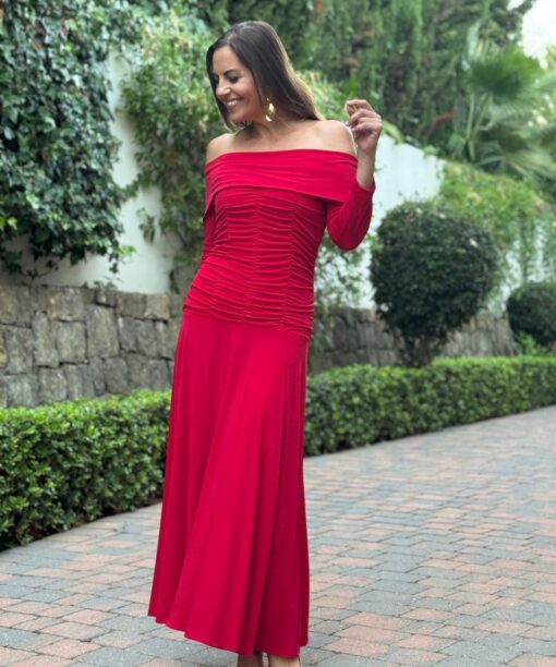 Escote bardot (no se baja, tranquila). Tacto increíble…largura perfecta, manga francesa y lo mejor de todo es que viene rizada toda la parte de la barriguita.